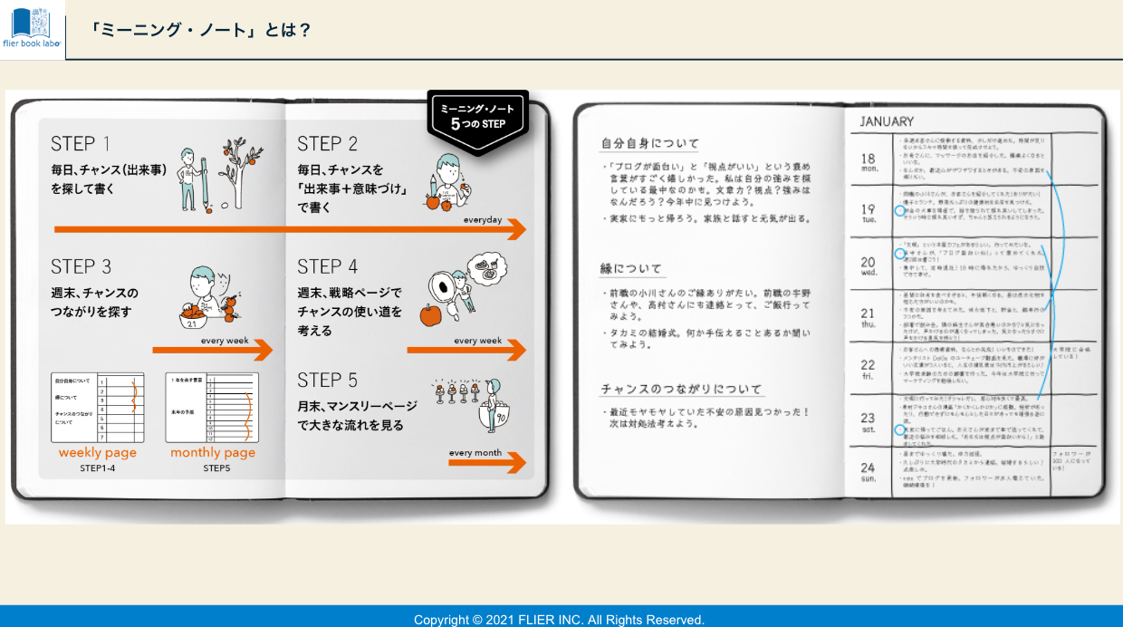 山田智恵氏(以下、山田):「ミーニング・ノート」はジャーナリング(書くこと)とリフレクション(振り返り)を組み合わせたものになっていて、毎日3つの自分がチャンスだと思ったことを書いてもらいます。書く際は出来事だけでなく、そこからの気づきや学びなど「意味づけ」もセットで書くようにしています。そして週末に1週間のチャンスを振り返って、気づいたことをまとめとして記録します。