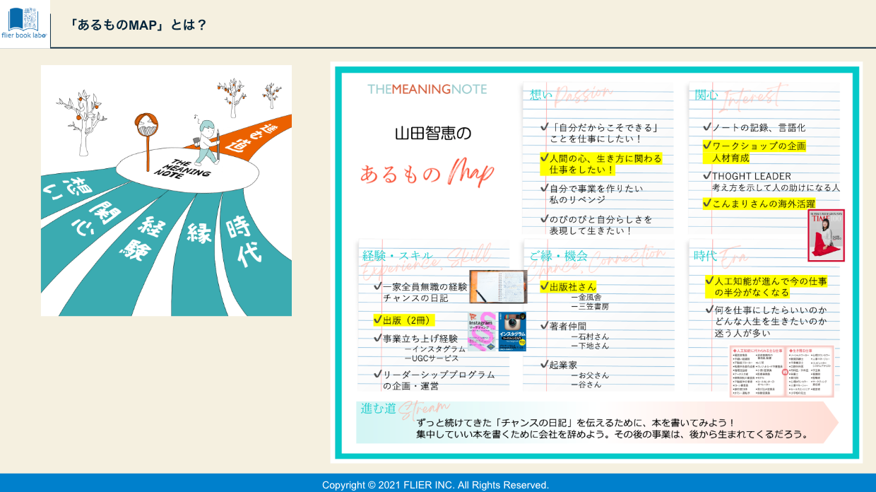 ゲストスピーカーは、オンライン講座「flier book camp」で講師を務めてくださる山田智恵さんです。山田智恵さんが3月より担当する講座は、題して『あなたの無形資産を見つける「ミーニング・ノート」実践講座 』。