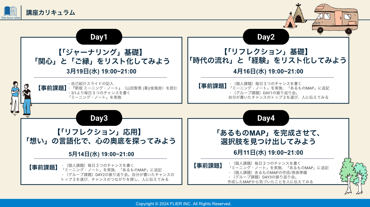 山田:皆さんには毎日「ミーニング・ノート」を記録していただきながら、DAY1ではジャーナリング、DAY2、DAY3ではリフレクションの基礎と応用をやっていきます。それと並行して「あるものMAP」を書き溜めていって、全4回を通じて完成できればと思っています。