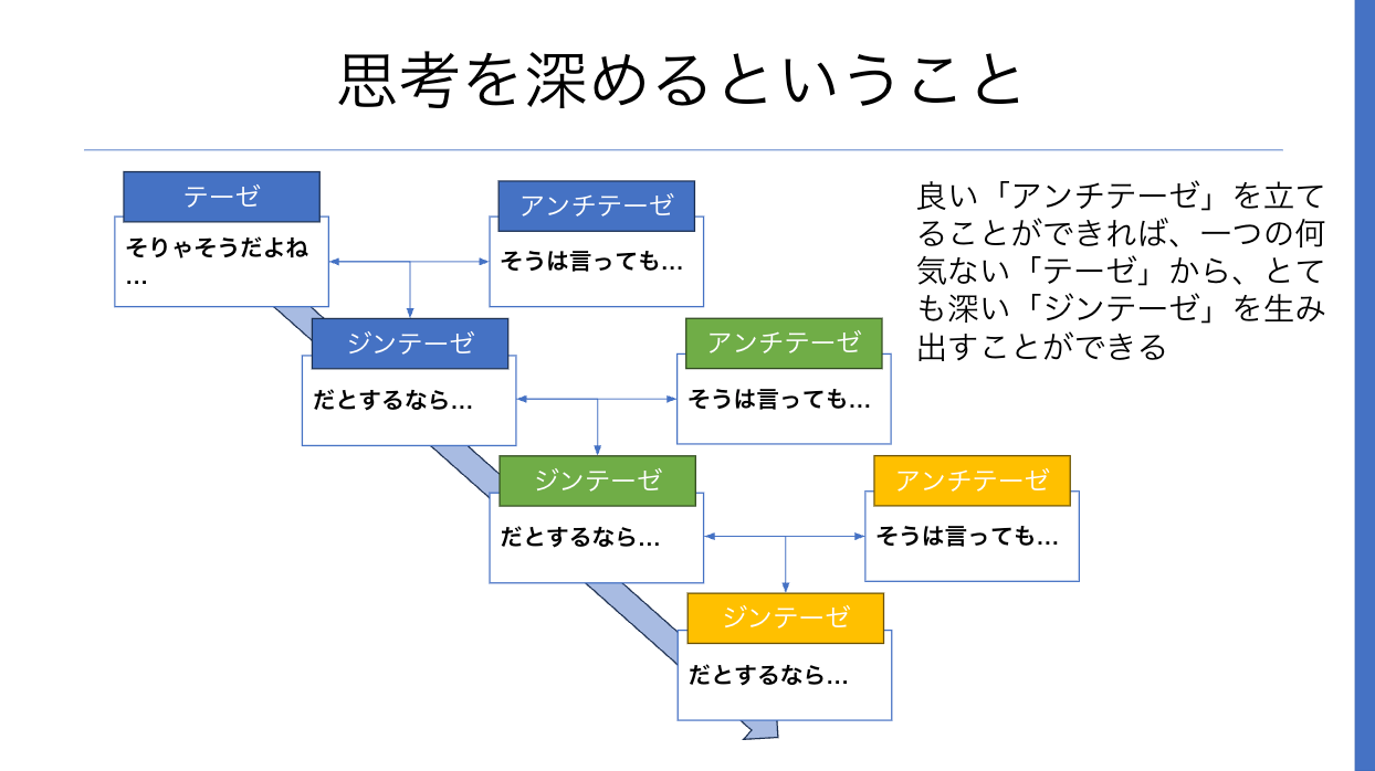 荒木:「テーゼ→アンチテーゼ→ジンテーゼ」のサイクルを回すことで思考が深まります。例えば「あなたの職場で皆の考え方を一致させるためにはどうすれば良いか」という問いに対して、「組織内で密なコミュニケーションを取るべき」というテーゼが立つ。それに対して「密なコミュニケーションを取るべきなのはわかっているが、その時間がない」というアンチテーゼが立ちます。そのテーゼ・アンチテーゼをふまえると、「限られた時間で密なコミュニケーションを取るにはどうすれば良いか」というジンテーゼが生まれてくる。そのジンテーゼに対してまた新しいアンチテーゼ、ジンテーゼ…というように思考を深めていくことで、本質的な解決策に近づくことができるんです。