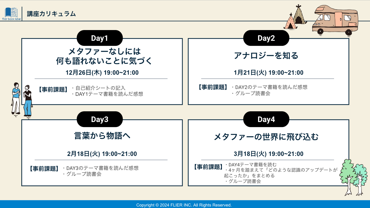今回のセッションでは、株式会社フライヤーで「flier book camp」企画運営を担当する久保彩のファシリテーションで、プログラムの内容を先取りしてご紹介いただきました!