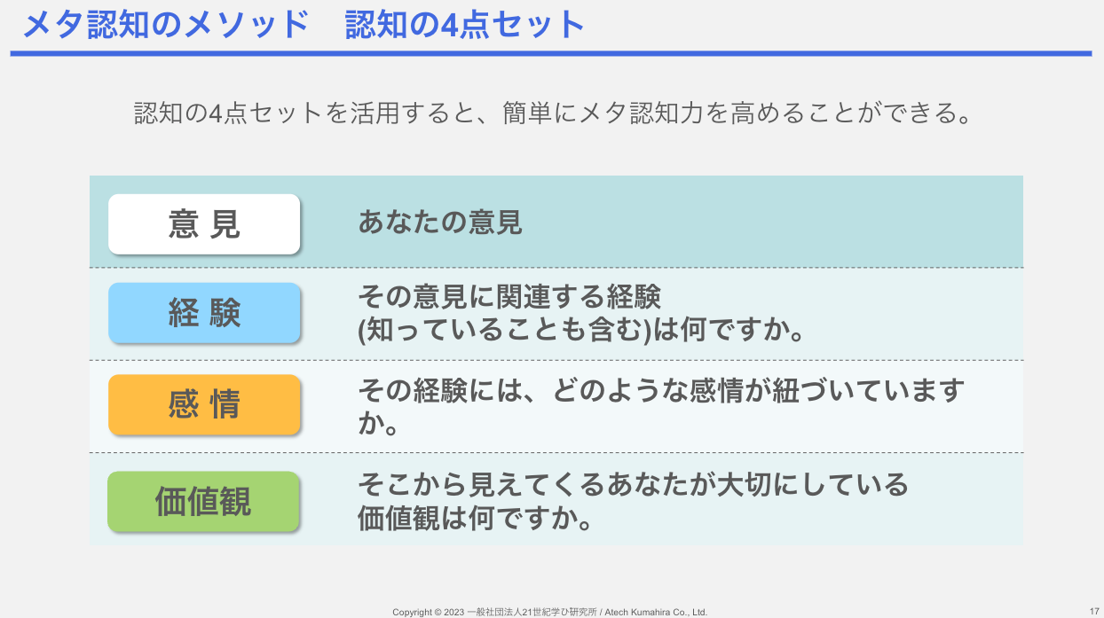 熊平:まずは認知していることを自分で認知する「メタ認知」ですね。メタ認知を簡単にやってもらうために認知の4点セット(意見・経験・感情・価値観)をご紹介しています。自分の意見の背景には必ず経験や知っていることがあるし、その経験の記憶は感情と繋がっていて、感情を抜き取ってみると価値観が見えてくるんですね。意見の根底にある、自分が大切にしている価値観やものの見方を理解しようというのが認知の4点セットです。