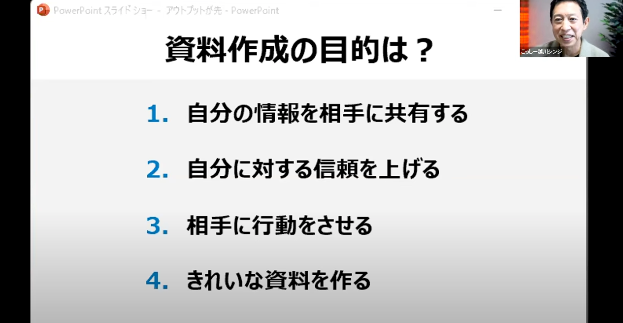 越川:まず皆さんにお伺いしたいのですが、資料作成の目的は①自分の情報を相手に共有する②自分に対する信頼を上げる③相手に行動をさせる④きれいな資料を作る のうちどれだと思いますか?
