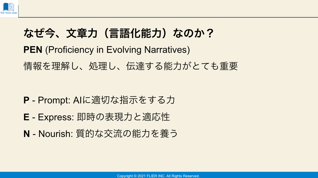 なぜ今、文章力(言語化能力)なのかという話をするために、今回「PEN」というフレームワークを考えました。情報を適切に理解し、自ら処理し、相手に伝達するスキルがとても重要だと考えています。
