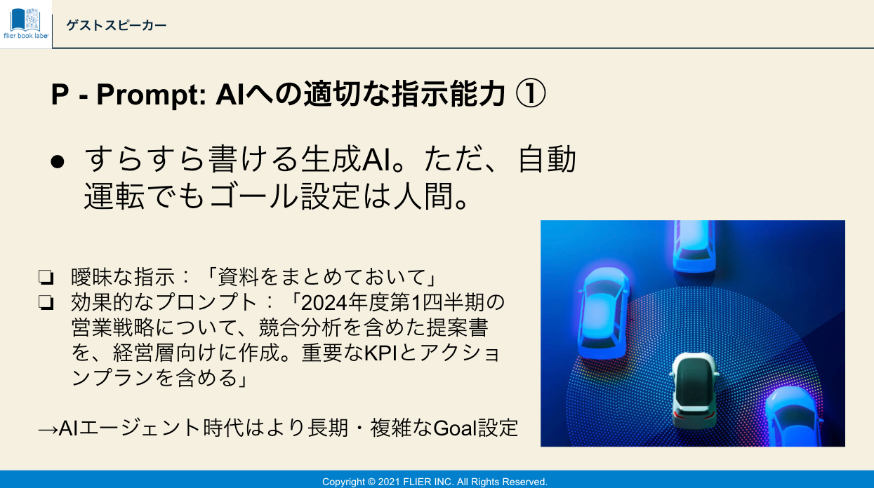 まず1つ目は「P - Prompt:AIへの適切な指示能力」です。
