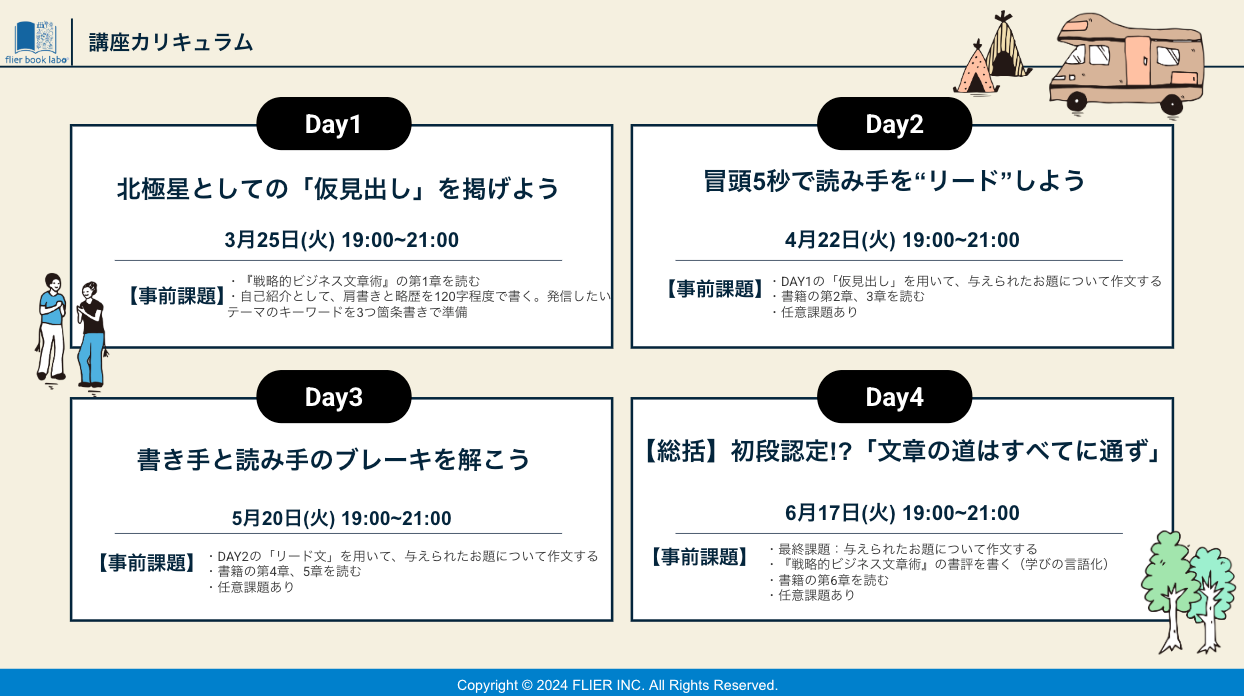 野上:私の書籍『戦略的ビジネス文章術 』は6章に分けて独自の文章術のフレームワークを提示しているのですが、これを4日間に分割してcampのプログラムを設計しています。